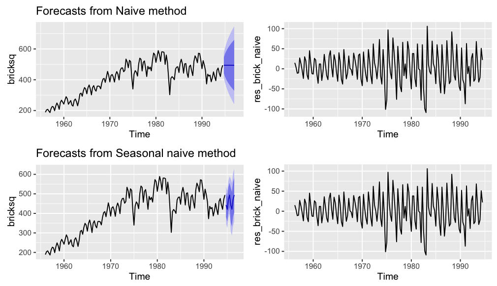 6. WWWusage, bricksq 데이터를 사용해 잔차 진단해보기. snaive(), naive()중 어느게 더 적절한지?