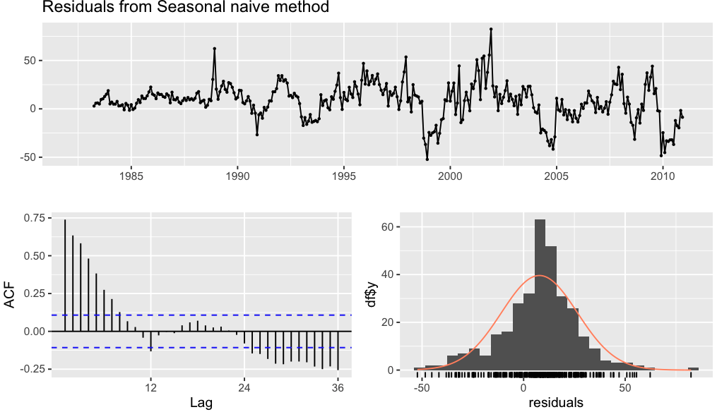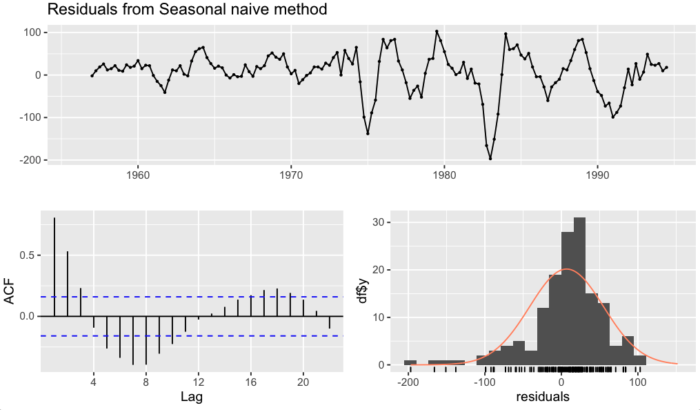 5. 1992년부터 호주 분기별 맥주 생산량 데이터에 계절성 단순 예측(seasonal naïve forecast)을 적용해서 얻은 잔차를 계산해보자. 잔차가 백색잡음이며 정규분포를 따르는지 확인해보자.