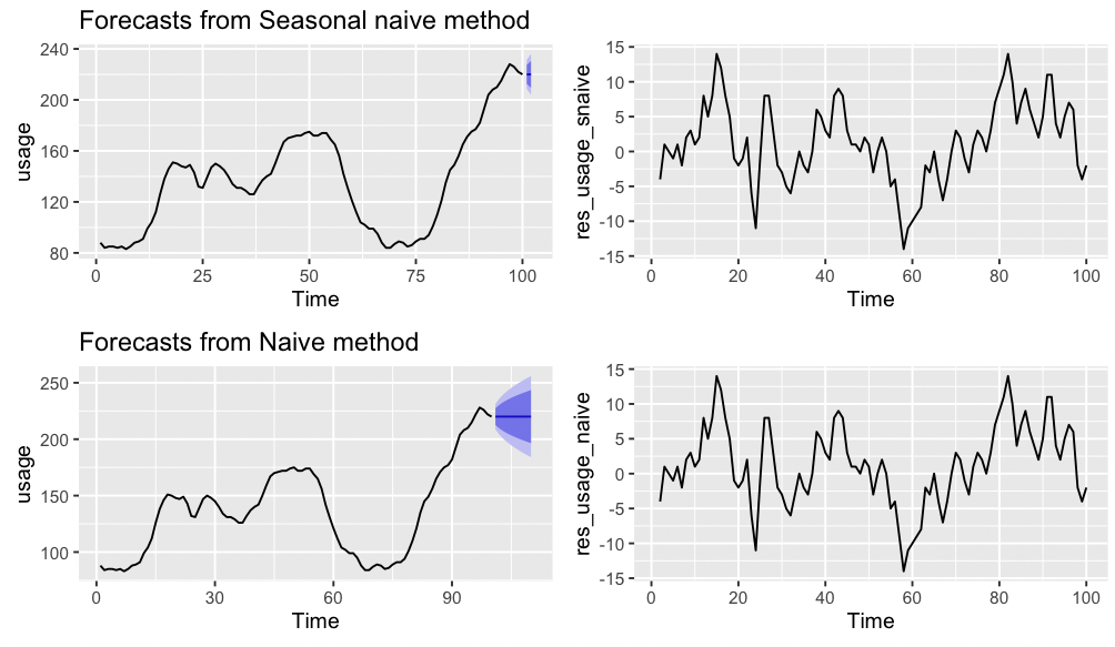 비교를 위해서 snaive, naive 둘다 그려보았다.