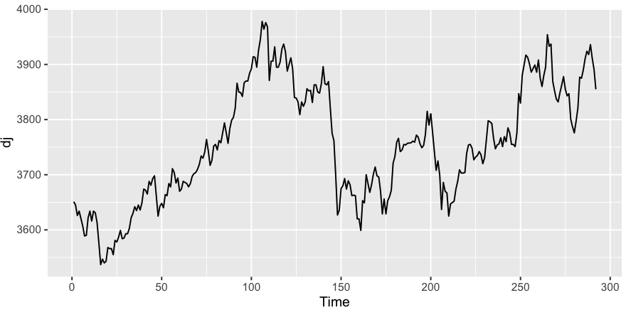 아래 스샷은 dj 데이터의 시계열이다. 박스-칵스 변환이 유용한 때는 시계열이 로그나 exponential한 트렌드를 보일때 유용하다. 아래 시계열의 경우 증가하거나, 감소하는 트렌드는 보이지 않는다. 하지만 약간의 주기는 보이므로, 날짜에 대한 조정을 하는 것이 나아보인다.