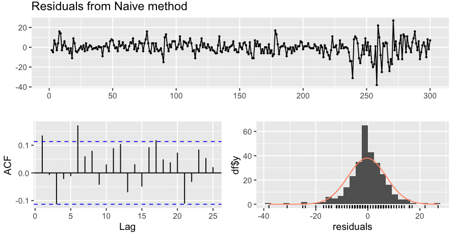 이제 잔차 테스트를 해 보자. naive의 잔차 테스트를 진행해 보았다. 잔차는 대강 평균이 0 근처이며, 표준분포에 비슷한 모습을 가지고 있다. 잔차와 백색소음이 같다는 가설은 기각된다. 융-박스 테스트의 결과 역시 가설을 기각하고 있다.