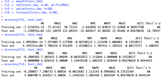 아래 스샷은 네가지 벤치마크를 사용해 본 결과이다. rwf는 상승을 추정하고, naive는 마지막값을 유지, 그리고 forecast는 하락을 예상한다. 이런 주가지수 예측에는 naive가 가장 나은게 아닐까 싶다.